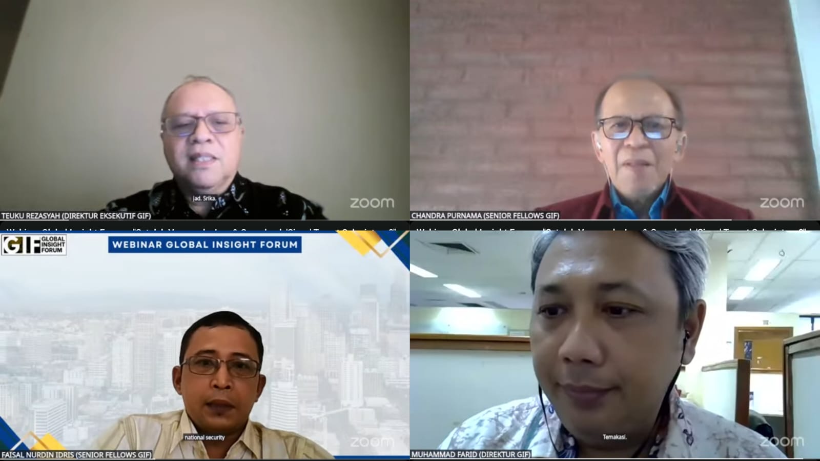 Webinar ini menghadirkan para narasumber strategis, yakni Teuku Rezasyah, Ph.D (Direktur Eksekutif GIF), Muhammad Farid, S.S., M.P.A, Ph.D (Cand.) (Direktur GIF), Chandra Purnama, MS, Ph.D (Senior Fellows GIF), dan Faisal Nurdin Idris, M.Sc., Ph.D (Senior Fellows GIF), dengan moderator Rizki Ananda Ramadhan, S.IP., M.Han., Ph.D (Cand.).